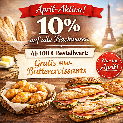 Sie erhalten 10 % auf alle Backwaren und ab einem Bestellwert von 100 € gibt es gratis Mini-Buttercroissants dazu! Perfekt, um Ihre Bestellung noch ein kleines bisschen genussvoller zu machen.